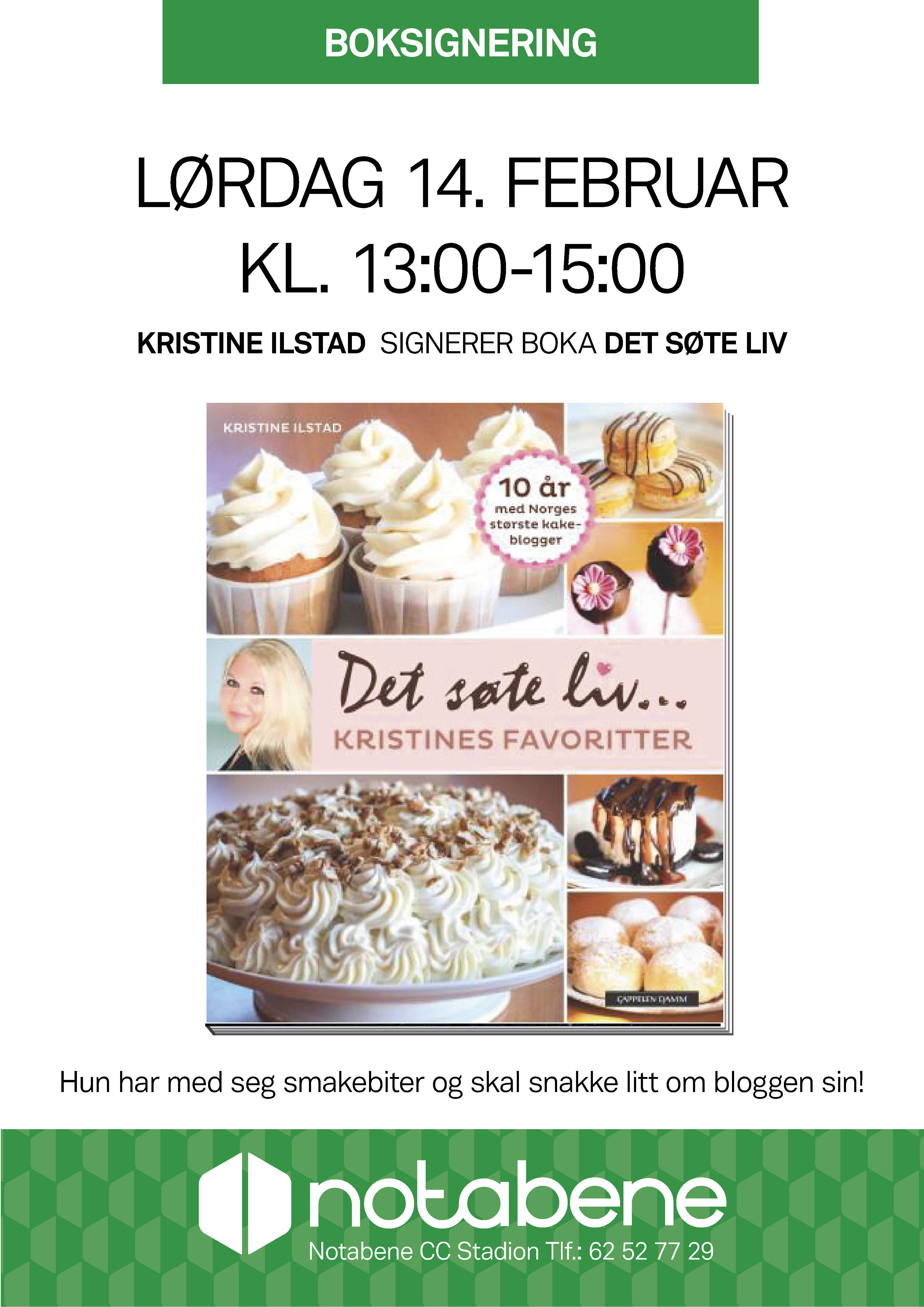 I så fall må du gjerne komme innom bokhandelen Notabene som ligger i kjøpesenteret CC Stadion på førstkommende lørdag, 14. februar. Jeg er der fra kl. 13 - 15 og ser frem til å hilse på deg, enten du vil at jeg skal skrive en personlig hilsen i boken din eller bare vil slå av en prat.
