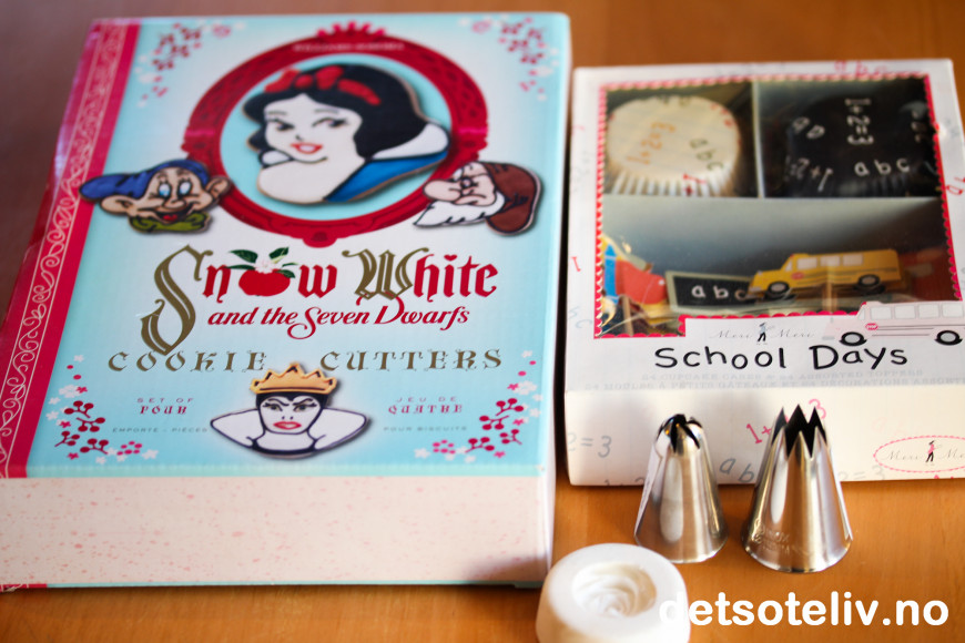 Også disse kjeksutstikkerne har jeg kjøpt i USA. Med utstikkere og stempel kan du lage vaniljekjeks med alle de kjente og kjære fjesene fra Snehvit og de 7 dvergene.