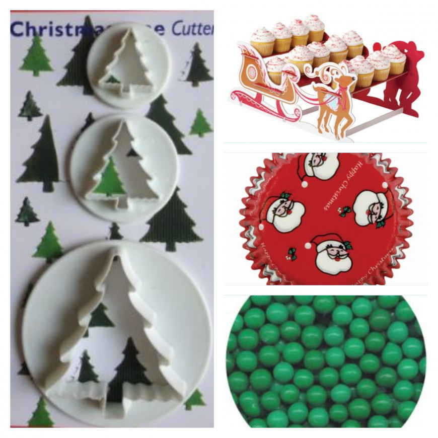 Med dette utstyret kan du lage kjempesøte julecupcakes som du kan servere i et cupcakesstativ formet som juleslede! I tillegg får du et utstikkersett så du kan lage pepperkaker, kakemenn eller andre julekaker med juletrefasong i 3 ulike størrelser.
