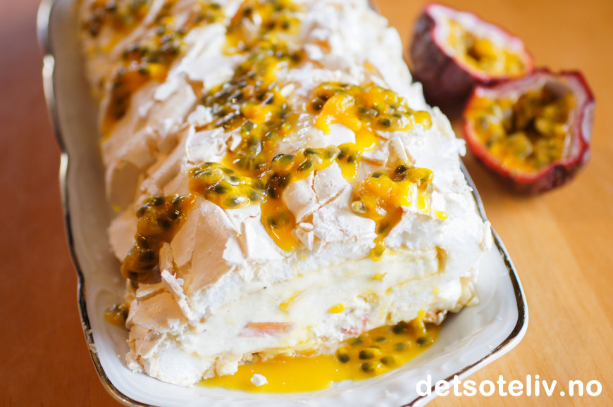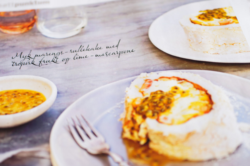 1. Myk marengs-rullekake med tropisk frukt og lime-mascarpone