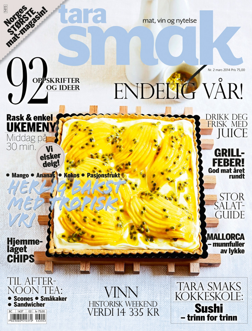 Jeg har vært fast leser av Tara Smak så lenge jeg kan huske! Det er alltid en glede å få dette matbladet i posten, spennende å se hvilke oppskrifter som er valgt ut og ikke minst la seg friste av de überlekre matbildene. Det er kanskje særlig matbildene som gjør at jeg er så begeistret over Tara Smak - det er alltid store, blanke nærbilder med sterke farger, som gir deg følelsen av at det bare er å strekke hånden etter og forsyne seg av det som er på bildet.