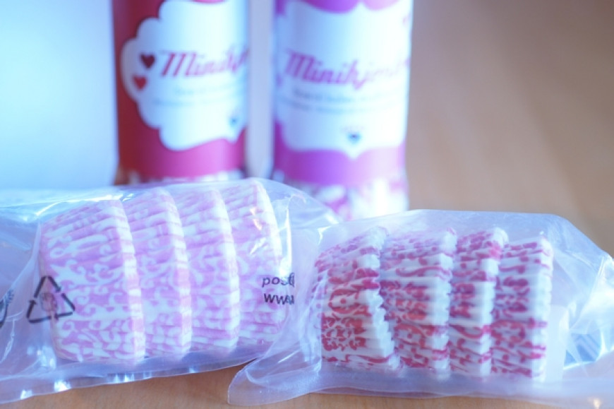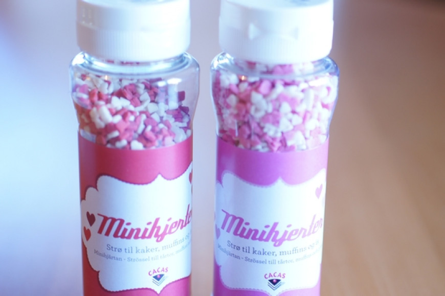 Mini-hjertestrøsselen passer perfekt til mini-cupcakes, så jeg sender også med 2 pakker med matchende mini-cupcakeformer med vakkert mønster i rosa/hvitt og rødt/hvitt. Også disse er fra Cacas.