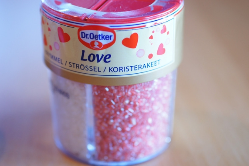 Og ikke nok med det - en pakke assortert kakestrøssel i rødt og hvit fra Dr Oetker følger også med!