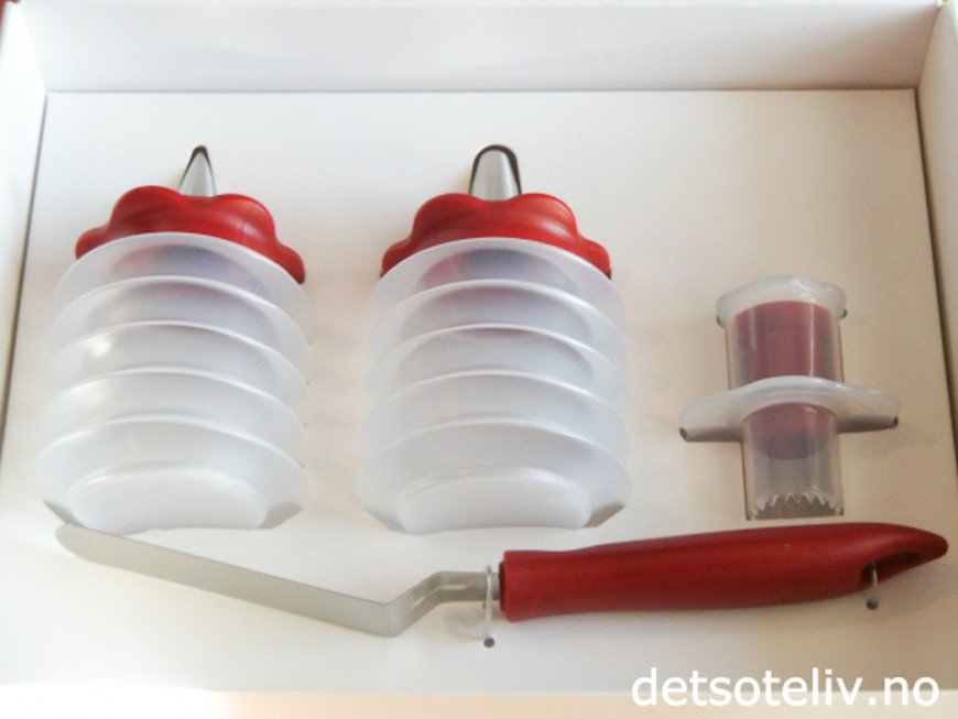 Her finner du for det første denne esken med praktisk utstyr spesielt beregnet på å fylle og pynte cupcakes!
