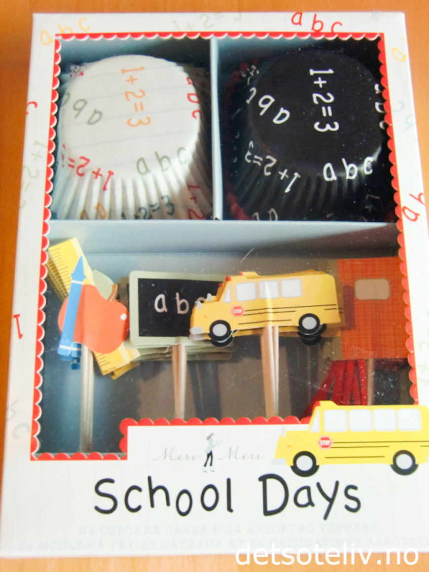 Den andre pakken med cupcakesformer passer godt til skolebarn. Her står det ABC på cupcakeformene og pyntepinnene illustrerer tavle, skolebok, penal og skolebuss.