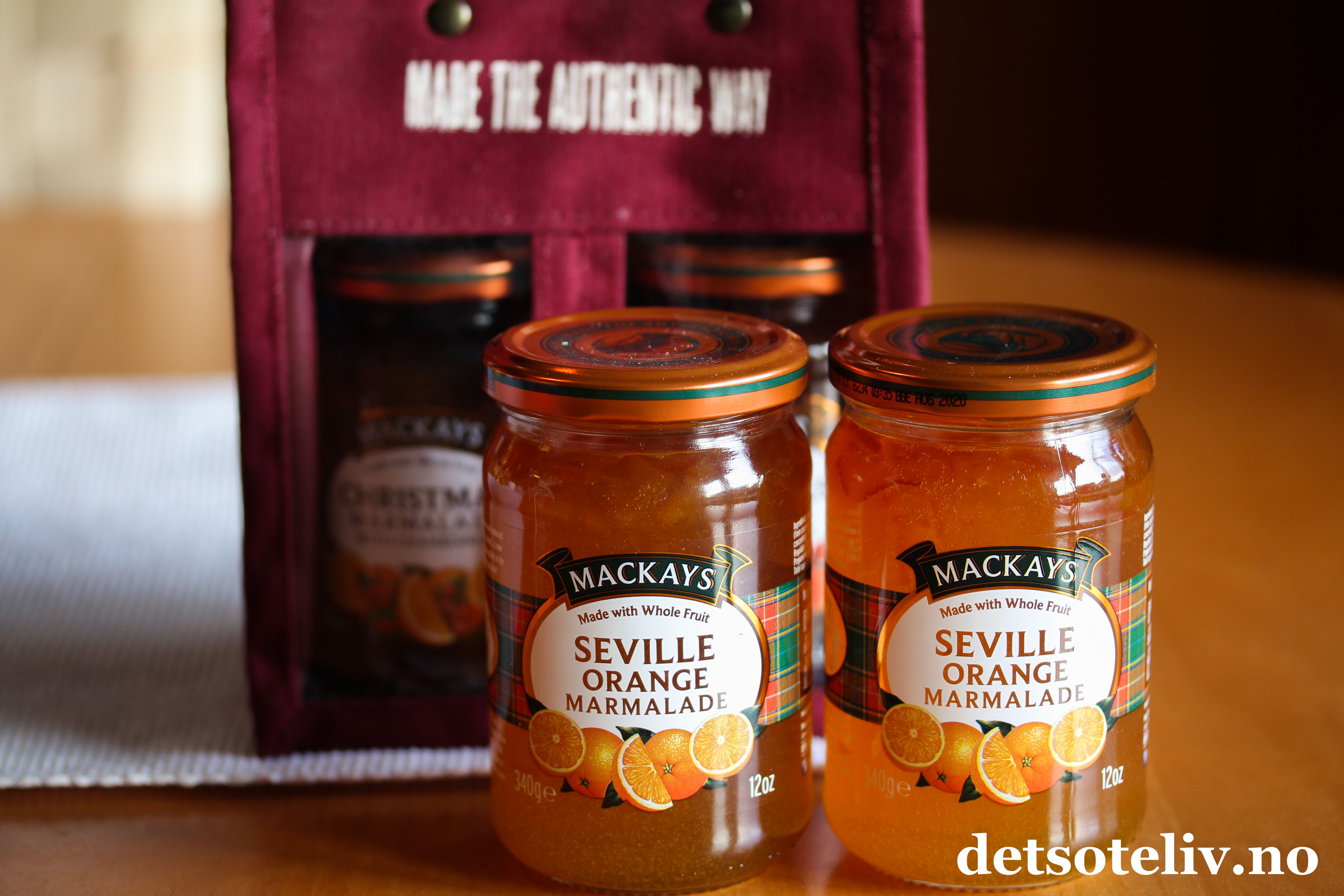 Her får du nemlig 4 stk utrolig gode marmelader av den berømte merket Mackays. Mackays ble grunnlagt i 1938 av to brødre og eies i dag av Grant familien som holder til i Skottland. Marmeladen håndlages i moderne produksjonslokaler og under streng observasjon for å sikre høy kvalitet og den perfekte hjemmelagde smaken på marmeladen. Mackays sine produkter er tilgjengelig i over 60 land over hele verden. Takket være importøren Oluf Lorentzen A/S får man også kjøpt marmeladene i norske butikker, blant annet i butikkene til Meny.