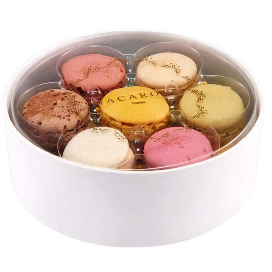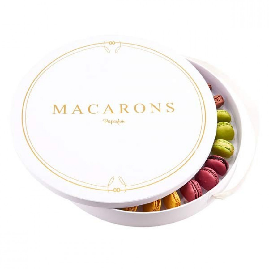 Denne runde esken med plass til 14 makroner er den perfekte størrelsen til små oppmerksomheter til venner og bekjente.
