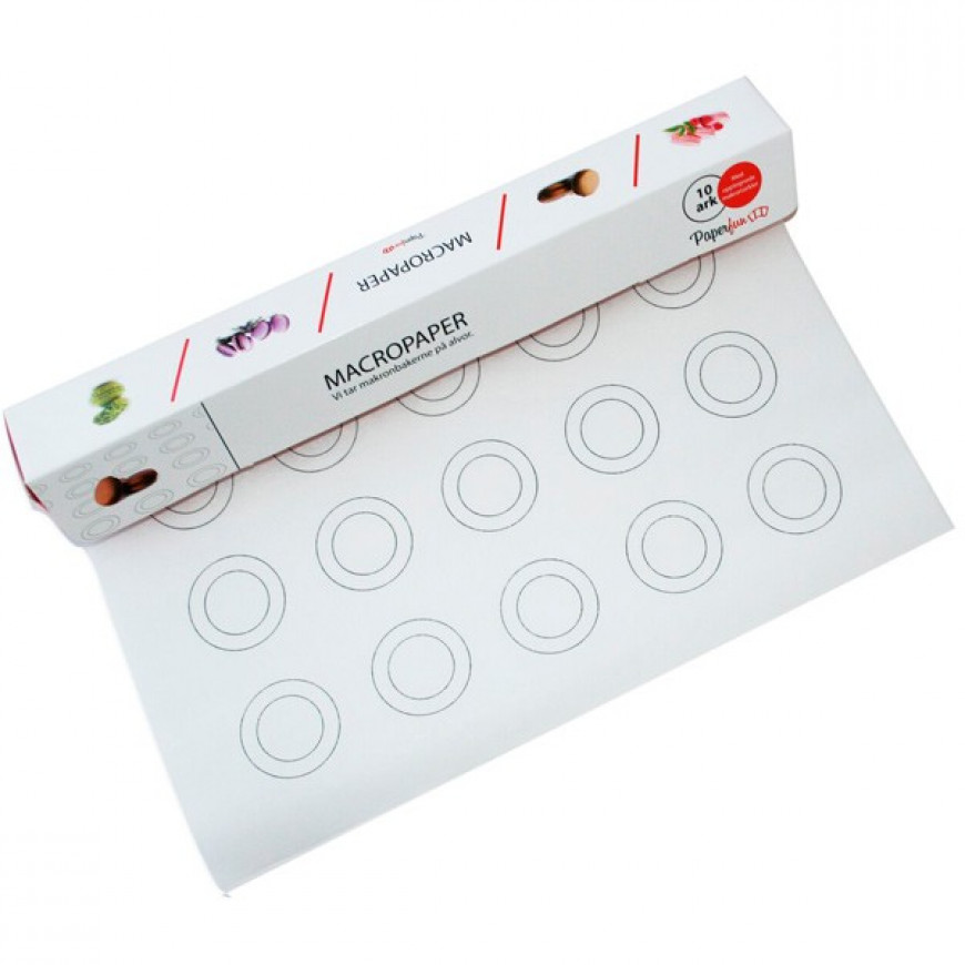 En annen helt essensiell ting når man lager franske makroner er å ha et bakepapir med ferdig opptegnede sirkler. Ellers er det vanskelig å få makronene like store. Man kan også bruke makronmatter av silikon med spesialtilpassede sirkler, se her, men mange synes at det er lettere å få et bra resultat med bakepapir.