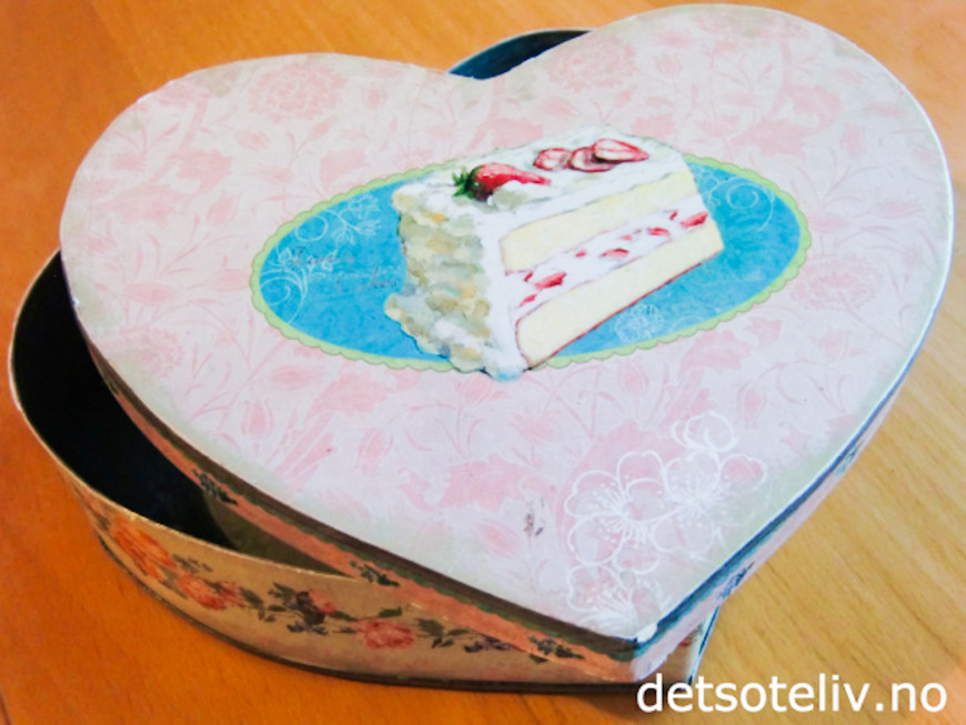 For det første gir jeg vekk denne nydelige, rosa, hjerteformede esken med søtt kakebilde på lokket: