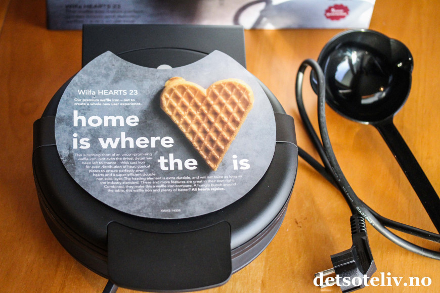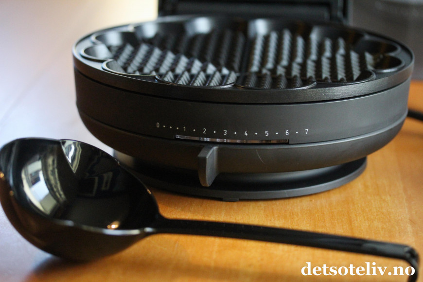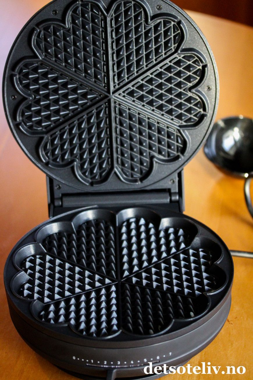 ♥ Det følger dessuten med en øse spesielt beregnet på dette vaffeljernet, som sikrer akkurat passe mengde vaffelrøre til hver vaffel. Dermed får du jevn tykkelse på vaflene og det skjer ikke lenger at vaffelrøre tyter ut av vaffeljernet under stekingen.