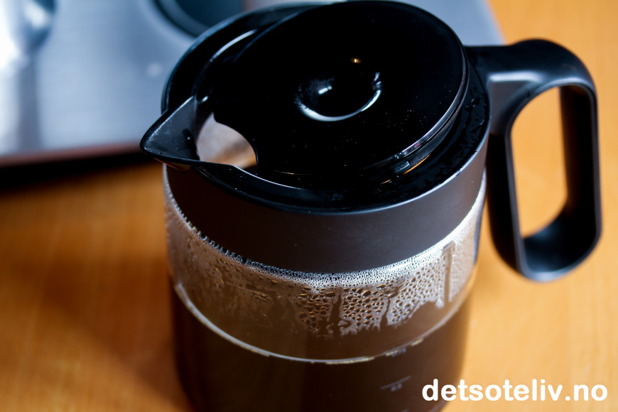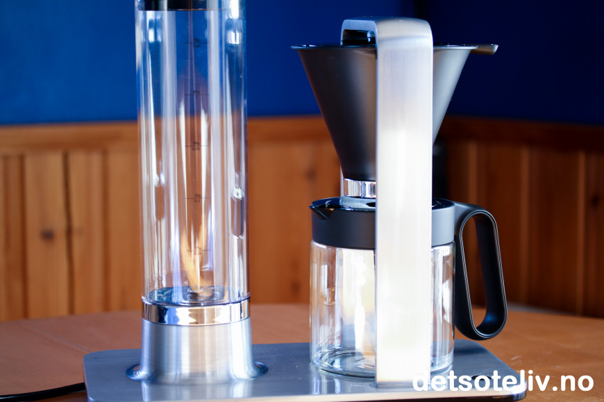 Så er kaffetrakteren in action, vannet pumpes opp og drypper ned i kaffebeholderen, for deretter å dryppe ned som nydelig nytraktet kaffe i kannen.