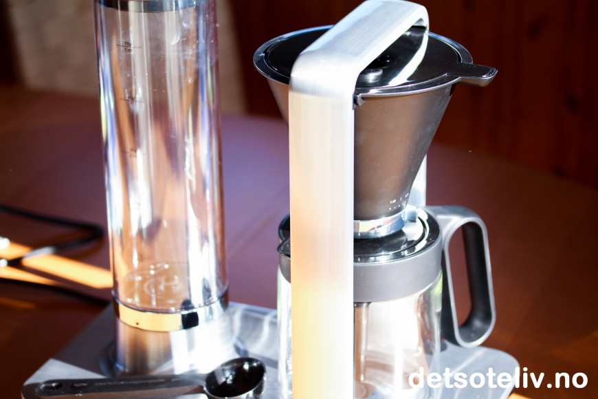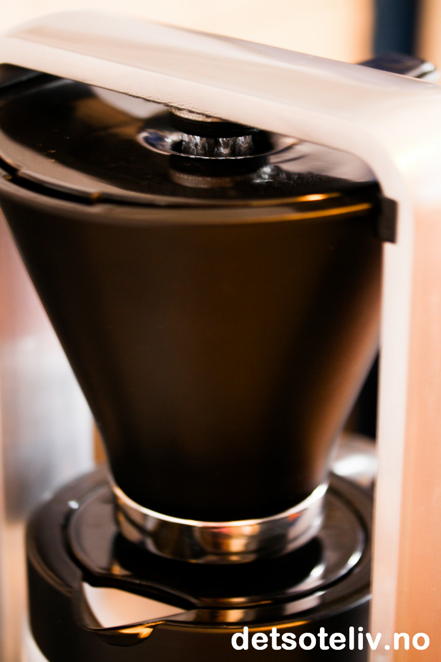 Kaffetrakteren har et stilig metallhåndtak som gjør det går lett å flytte på trakteren.