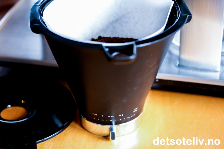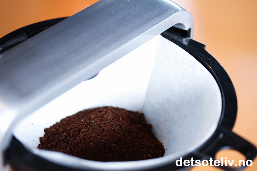 Så er det bare å fylle kaffe i kaffefilteret og sette kaffefilteret i filterbeholderen.