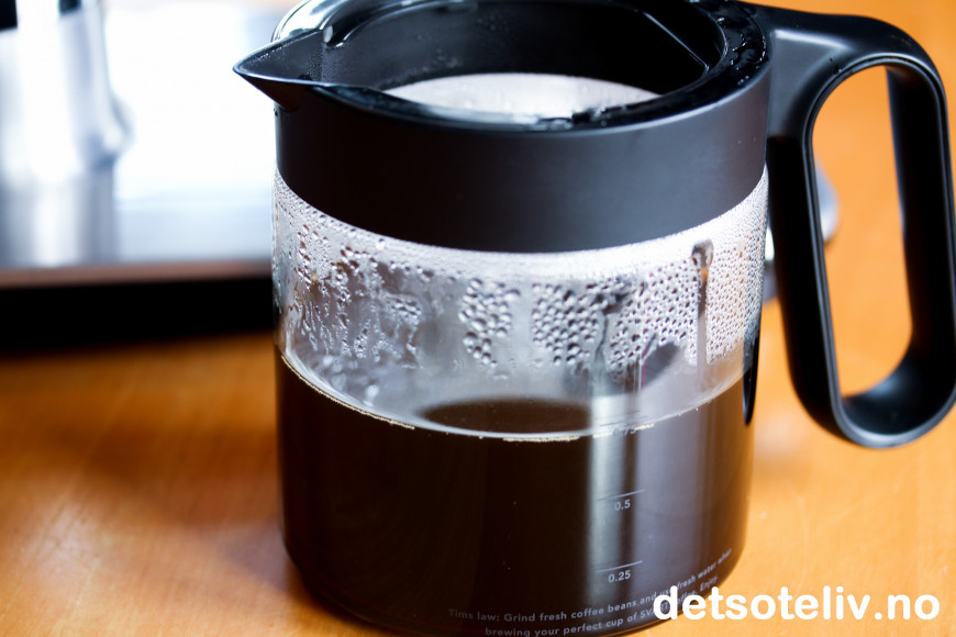 Jeg fikk lyst til å teste den ut med en eneste gang, og heldigvis hadde jeg kaffefilter og malte kaffebønner i heimen.