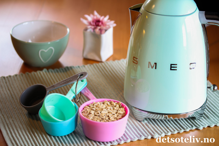 Jeg bruker bare lik mengde store havregryn og kokende vann.