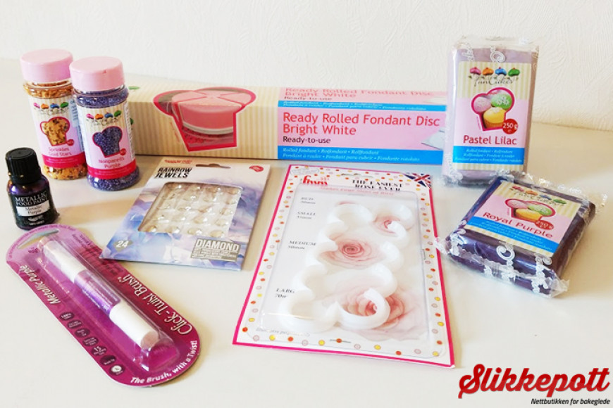 Giveawayen inneholder også to pakker lillafarget fondant; den ene mørkelilla og den andre lyselilla.