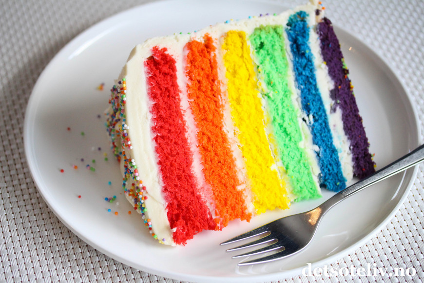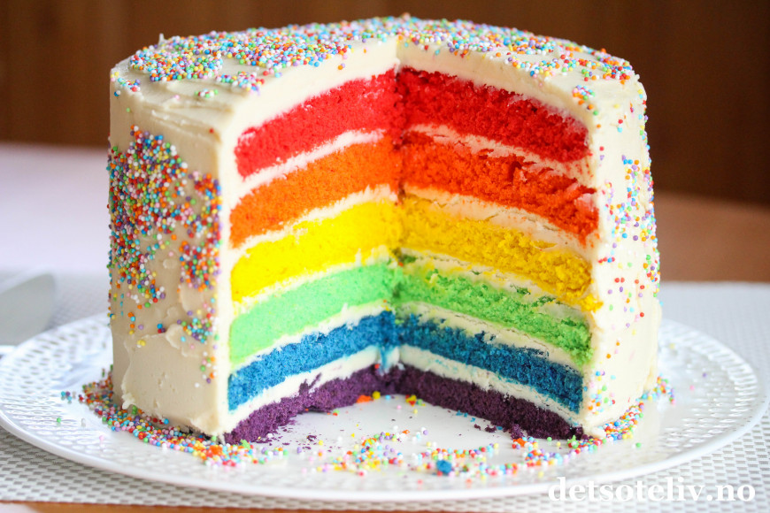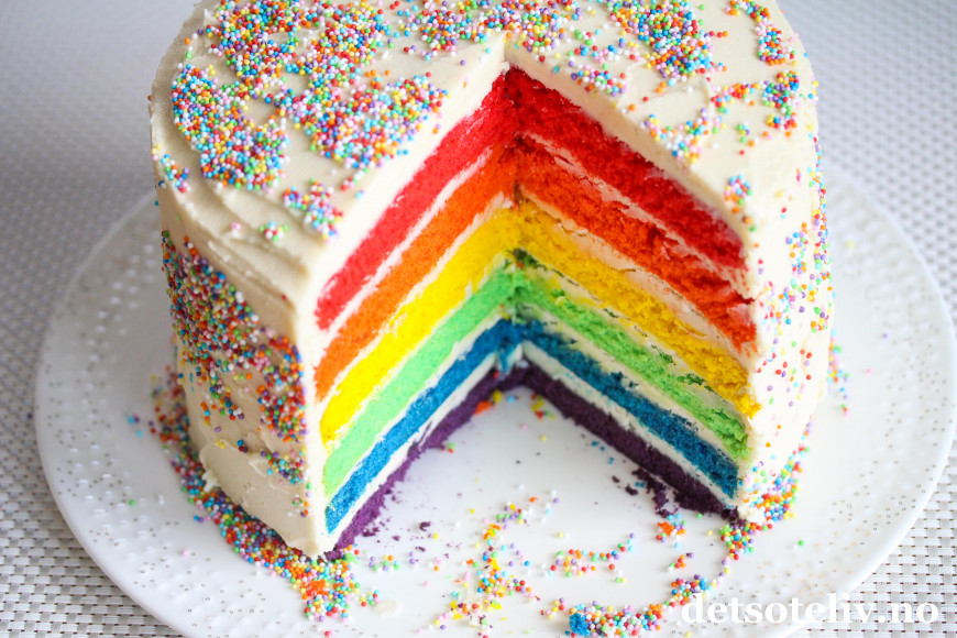Regnbuekake er en veldig populær kake her på Det søte liv! Kaken ser kjempeflott ut på kakebordet og er spesielt morsom å servere i barneselskaper og andre festlige lag.