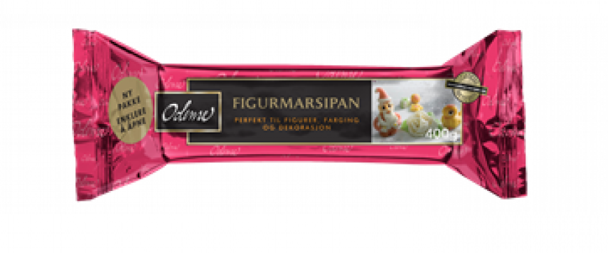 Videre har du Odense Figurmarsipan (rød pakke) som har lys farge, og som derfor egner seg veldig godt til å bli farget og formet til konfekt.