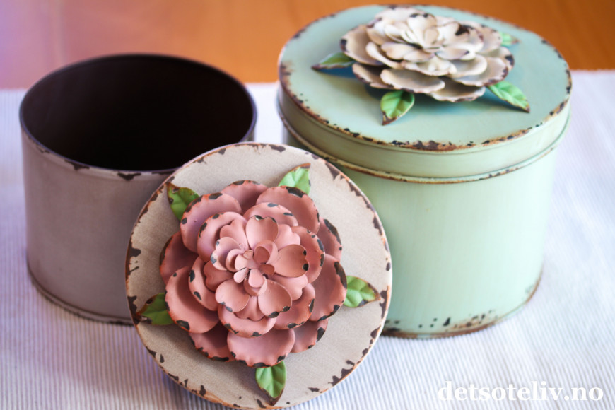 Boksene er metall og har nydelige farger og blomsterdekorasjon.