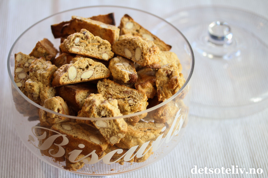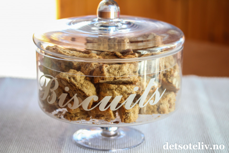 Jeg har her fylt opp glassbollen med julebiscotti (oppskriften kommer her på Det søte liv i løpet av de nærmeste dagene...)