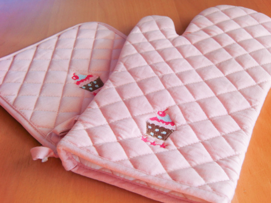 Så deler jeg ut dette lekre settet med rosa grytekluter: