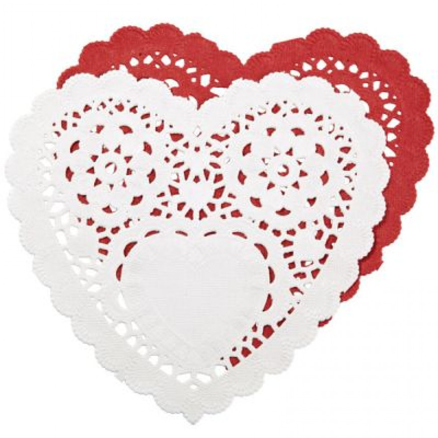 Det følger videre med en pakke med 12 røde og hvite hjerte kakeservietter (diameter 15,2 cm).