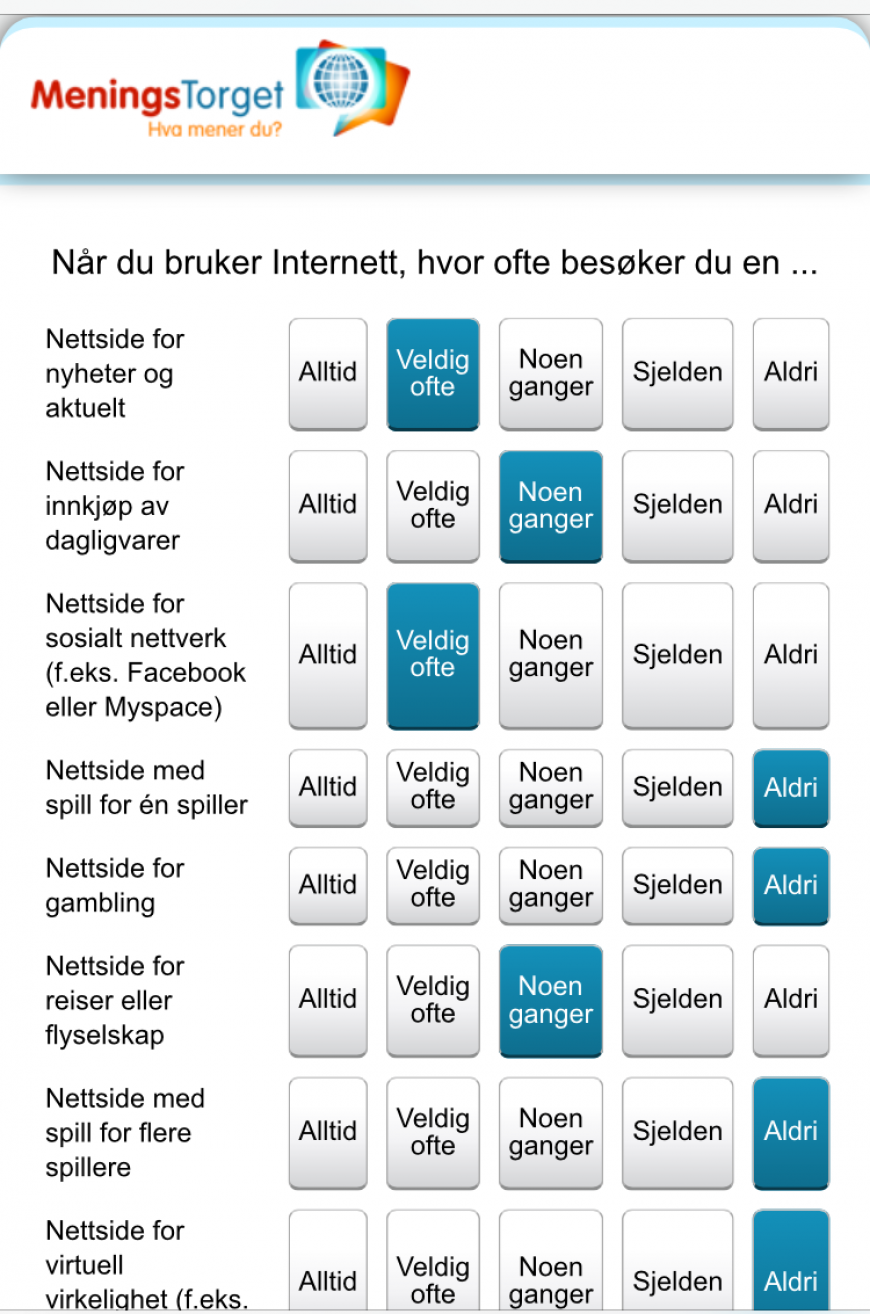 Det har vært en travel reisedag for meg i dag, men i en pause midt på dagen stakk jeg innom Meningstorget.no via mobilen og tok en undersøkelse som gjaldt mine internettvaner. Hvor ofte klikker jeg meg inn på nyheter vs sosiale nettverk vs nettsider for spill og gambling?
