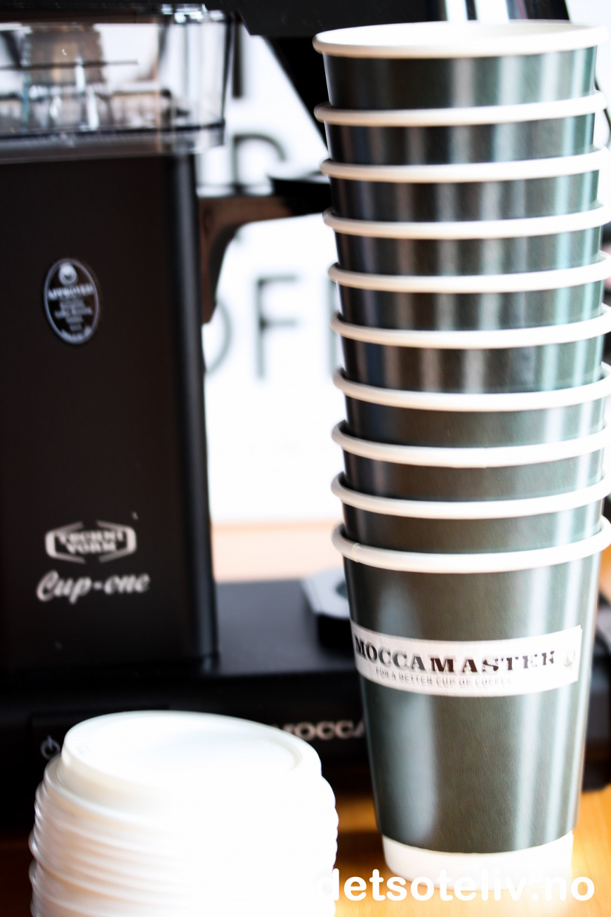 I tillegg fulgte det med noe som jeg synes var skikkelig kult, og som understreker det moderne konseptet, nemlig en høy stabel med stilige kaffebegre med lokk.