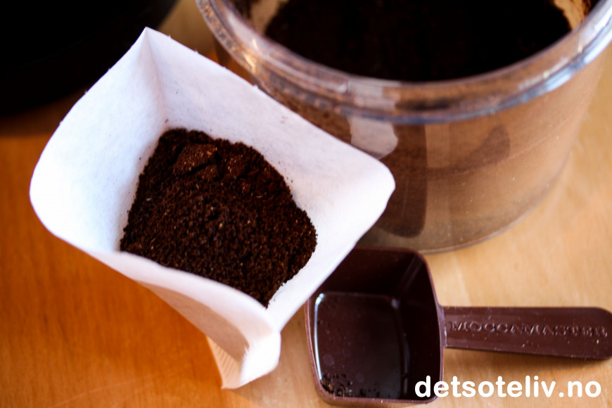 Så måler du opp malt kaffe med måleskjeen og har i et fuktet kaffefilter.