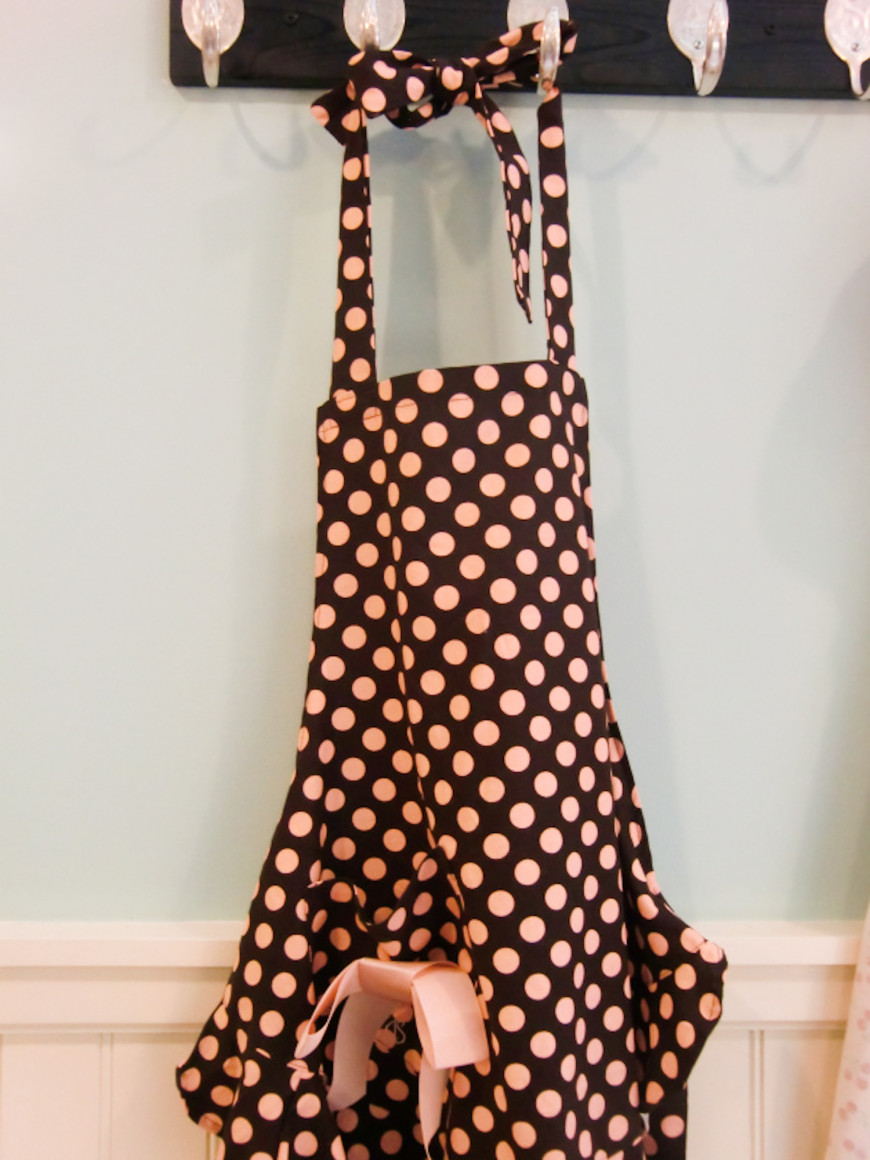 Her er mitt yndlingsforkle i brunt med rosa prikker:
