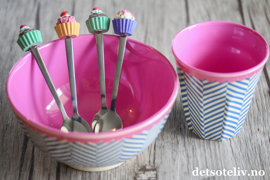 Giveawayen består av 4 stk skåler og 4 stk kopper med nydelige farger og i et hendig melamin-materiale. I tillegg følger det med 4 kjempesøte teskjeer.