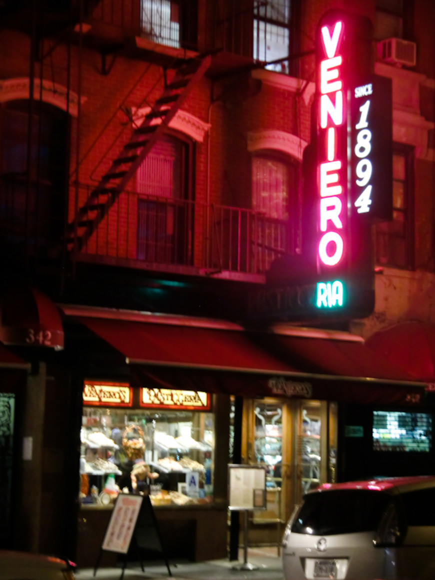 Først til Veniero's Pasticceria som er åpent til langt på natt. Jeg var innom her på kvelden med min søster som bor i New York.