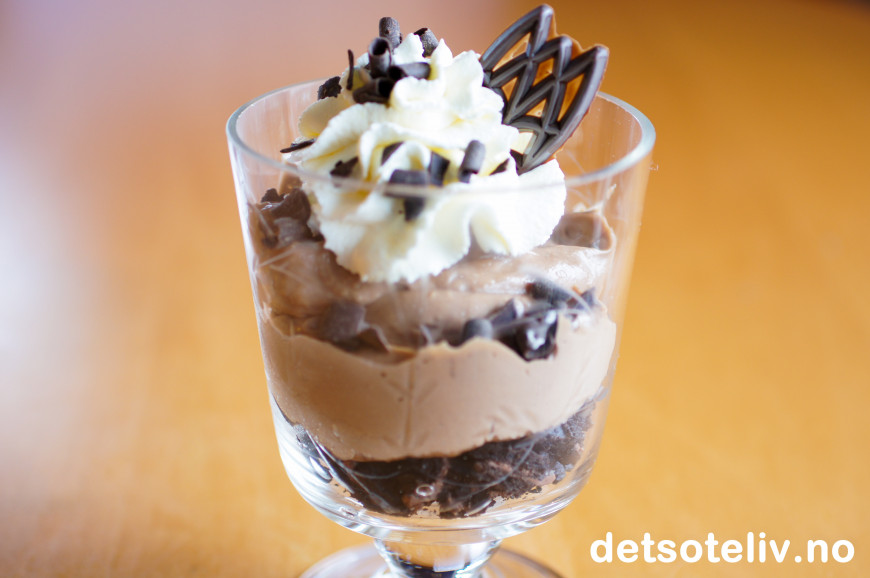 Før servering pynter du hvert glass med pisket krem og mørk sjokolade.