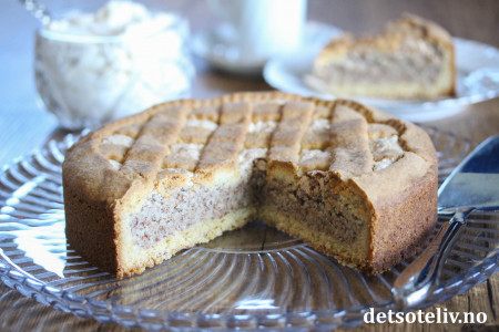Kaken består av myk mørdeig og deilig makronfyll og kjennetegnes av gittermønsteret på toppen.