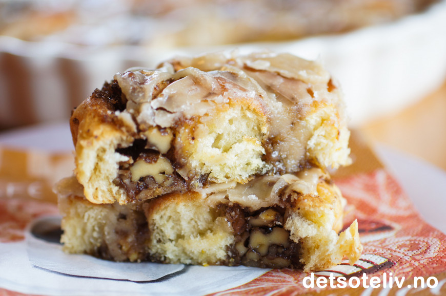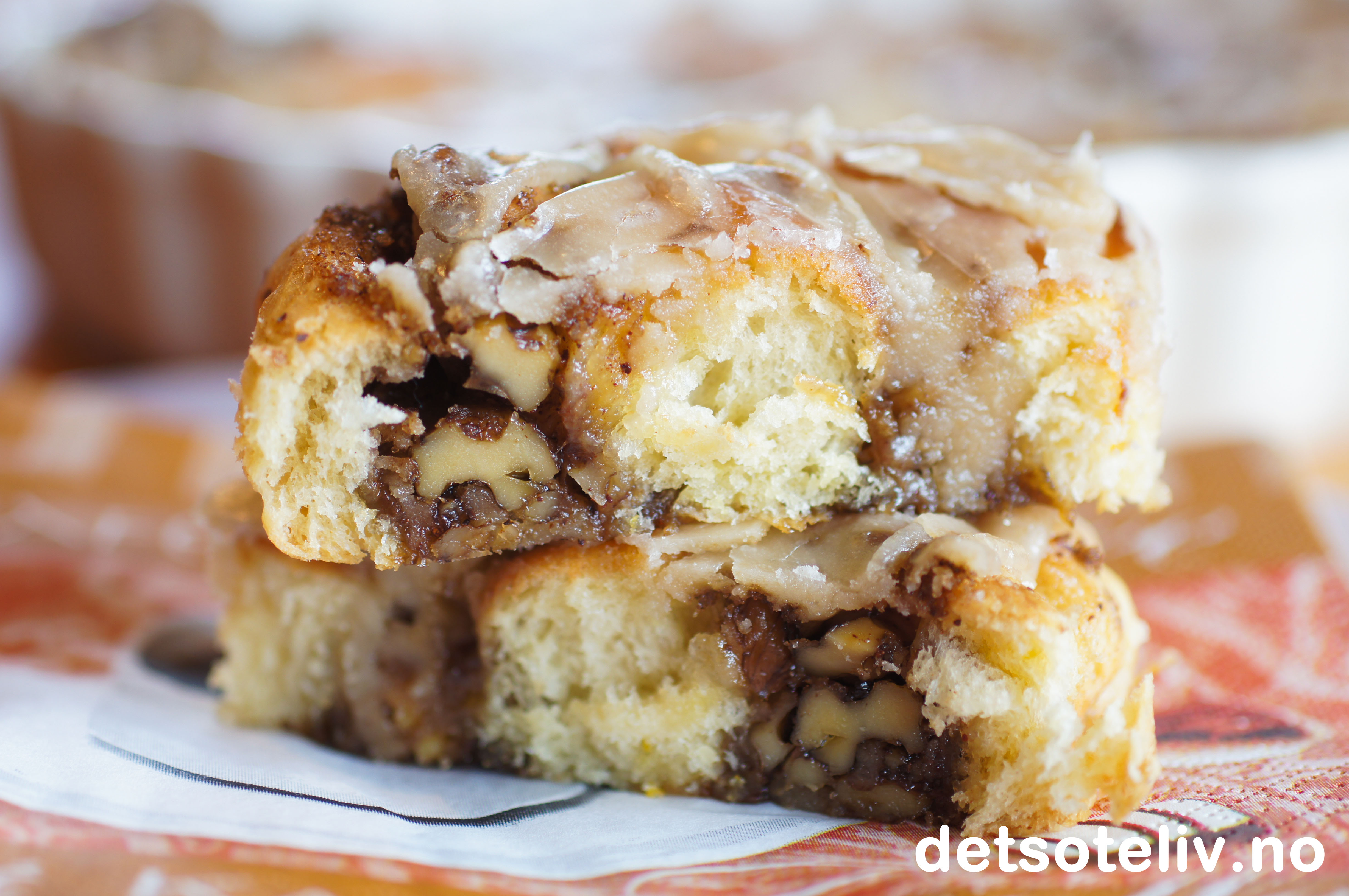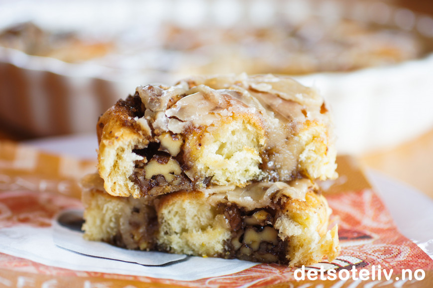 American Cinnamon Buns! Her har du herlige, amerikanske, klissete kanelboller med brunt sukker, pekannøtter og glasur!