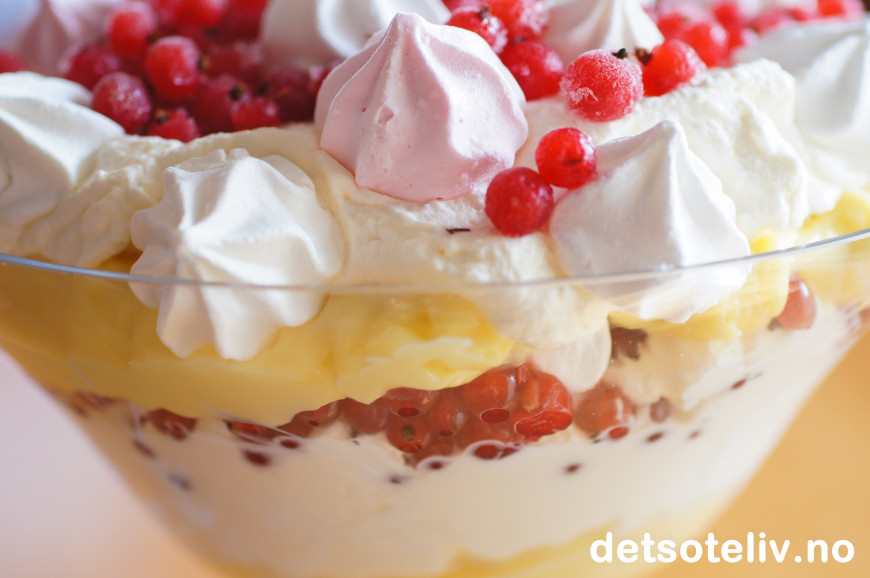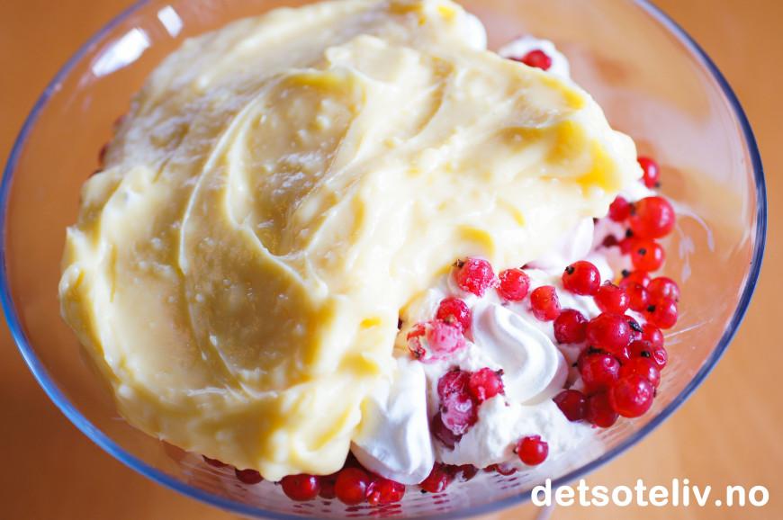 En dessert med lekre lag. Smakene blander seg godt med hverandre om desserten får stå i kjøleskapet i et par timer før servering. Da blir også marengsene litt mykere i konsistensen og blander seg bedre med kremen og vaniljekremen.