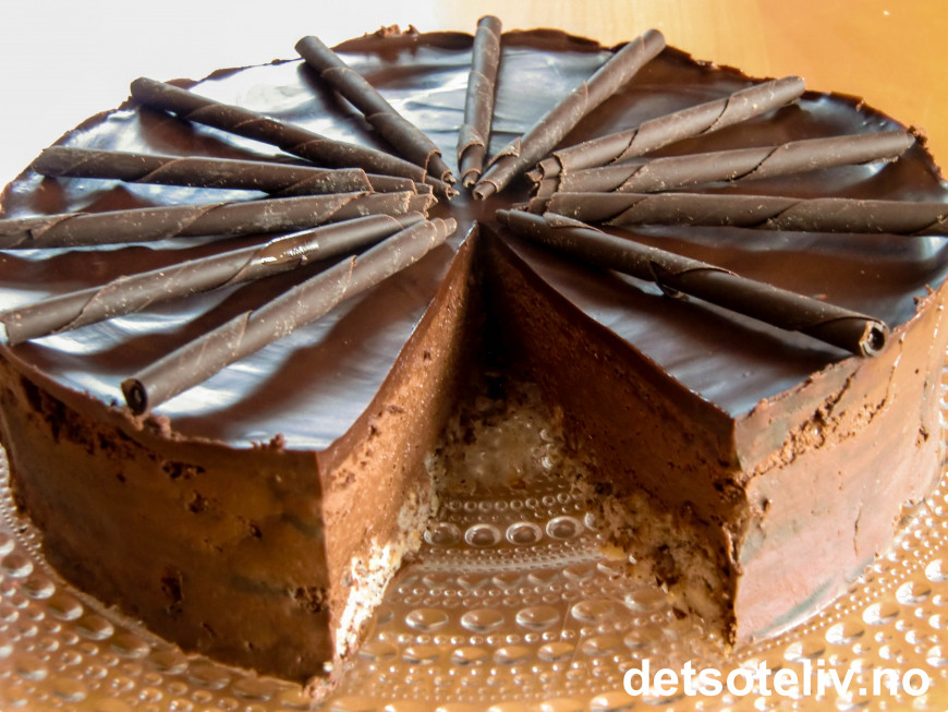 Bunnen består av en nøttekake og det tykke laget fyldig sjokolademousse oppå smaker fantastisk av mørk sjokolade og konjakk. Så er det et tynt lag helt mørk sjokoladekrem på toppen.