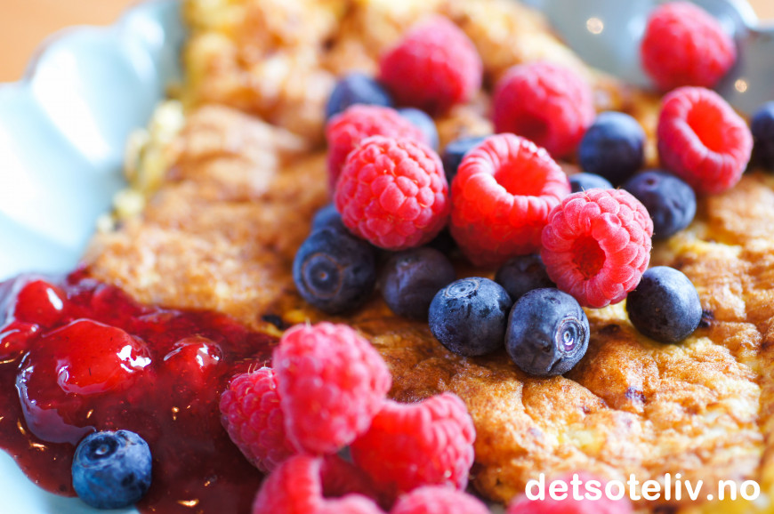 Del pannekaken opp i to-tre deler og legg på asjetten din. Server med lett syltetøy og friske bær!