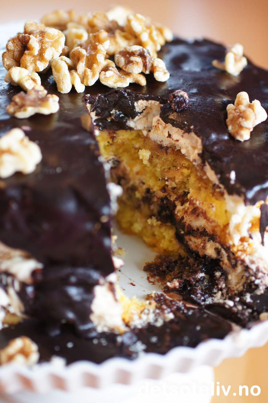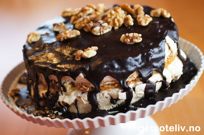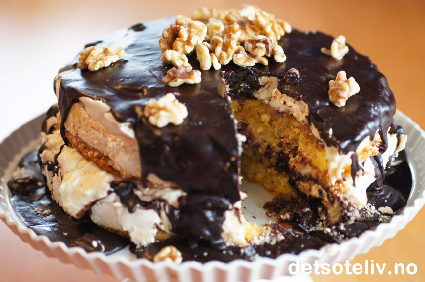Jeg elsker smakene av valnøtter, marengs, massse sjokoladeglasur, litt rom og krem...