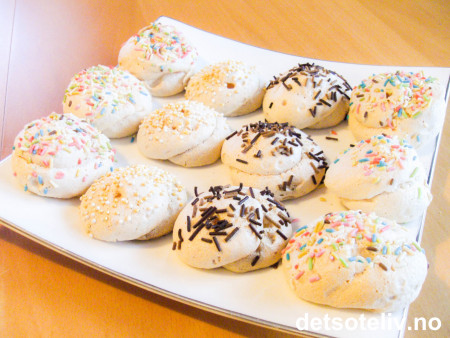 Sett små marengstopper ved hjelp av to teskjeer på bakepapirdekkede stekeplater. Dryss på kakestrøssel - gjerne forskjellige sorter.