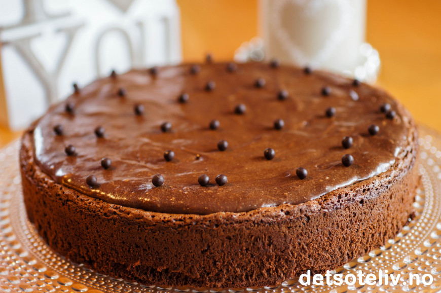 Hell så resten av sjokolademoussen over den stekte kaken i formen. Sett formen i kjøleskapet og la kaken stå der i minst 1 døgn før servering.