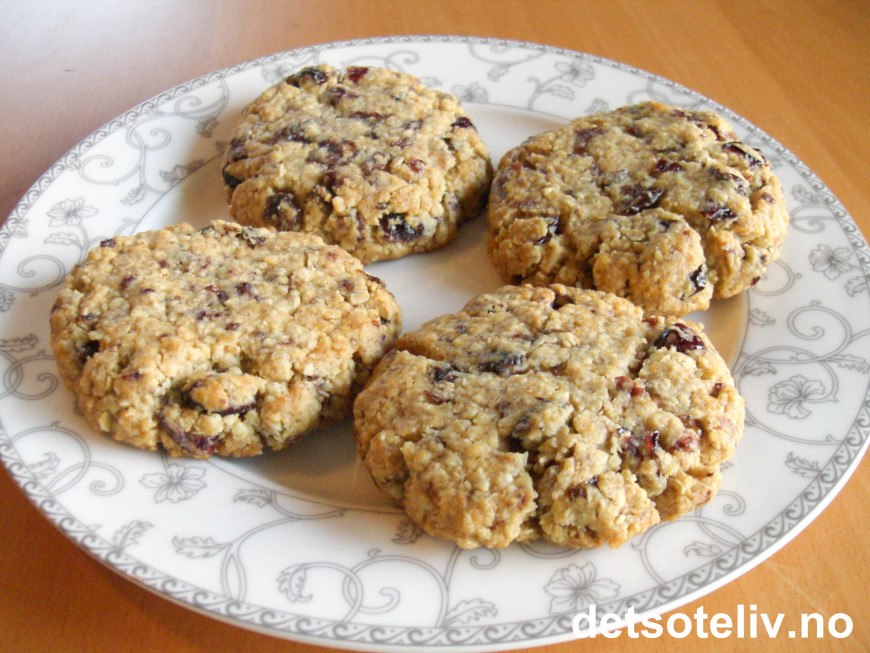 Bland mel, havregryn, sukker og bakepulver i en bolle. Tilsett smør og smuldre det i det tørre. Tilsett så sirupen (som er litt varmet opp slik at den er flytende) og vann. Bland til en jevn deig. Ha så i hakkede rosiner og hakkede tranebær.