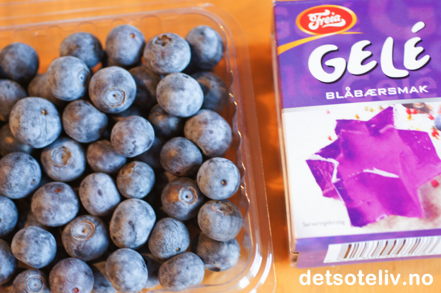 Kok opp vann og løs opp blåbærgeléen i vannet. Avkjøl til blandingen er helt kald, men ikke stivnet (se tips).