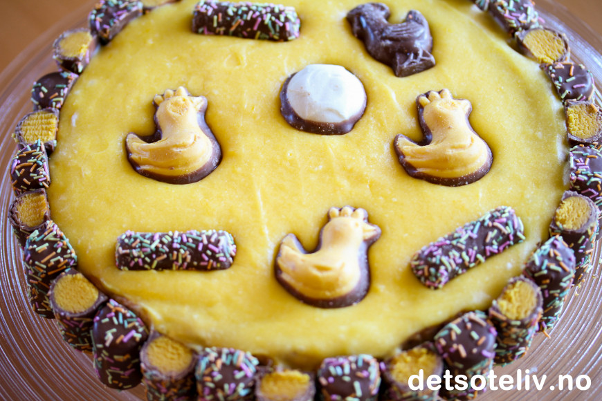 Smør appelsinkremen jevnt over kaken og også litt langs kantene. Pynt kanten av kaken med avkuttede stenger av påskemarsipan og pynt toppen med påskesjokolade og -marsipan.