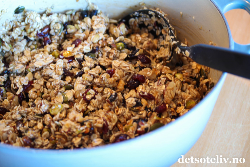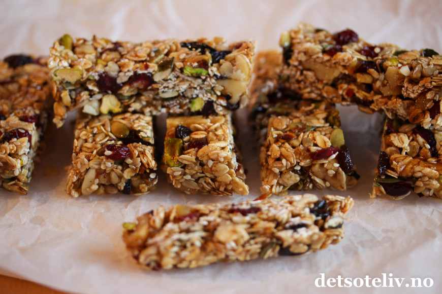 ♥ Jeg har her foreslått en blanding nøtter, kjerner og tørket frukt som jeg synes smaker veldig godt. Tranebær, pistasjnøtter, gresskarkjerner og apsikat gir dessuten lekre farger til barene. Du kan imidlertid bytte ut kombinasjonen nøtter og tørket frukt med den varianten du liker best.
