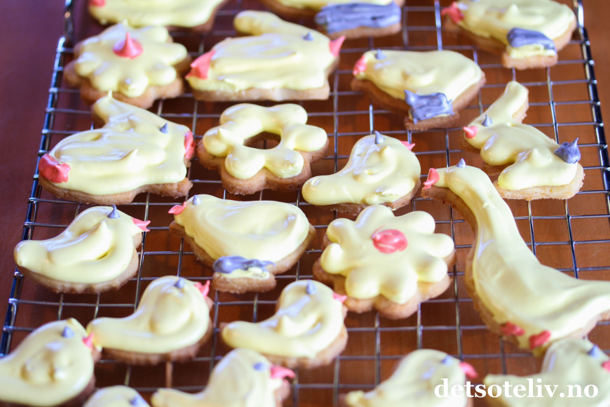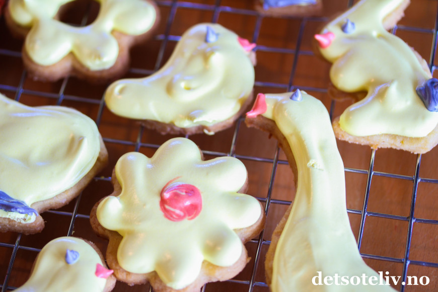 Stek kakene midt i ovnen ved 180°C i 10-12 minutter, til de er gjennomstekte, men fortsatt lyse i fargen. Steketiden avhengig av hvor store og tykke cookiesenede er. Avkjøl kakene til de er helt kalde før du starter pyntingen.