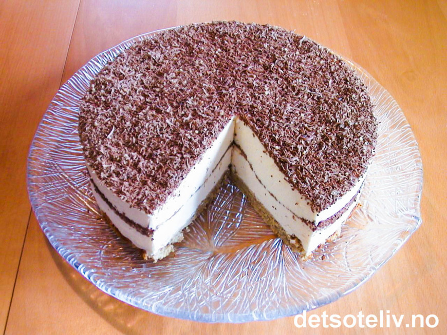 Jeg bruker ikke bunn jeg. Legger fromasjen lagvis med revet sjokolade i en stor bolle. God til dessert og til finere anledninger. Kan lages og fryses. Når den er tint, strør jeg på sjokolade på toppen også før servering.