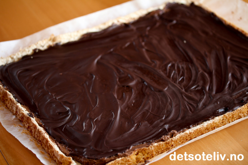 Sjokoladeglasur: Smelt kokesjokoladen sammen med smøret. Smør sjokoladen over den kalde kaken i et tynt lag.