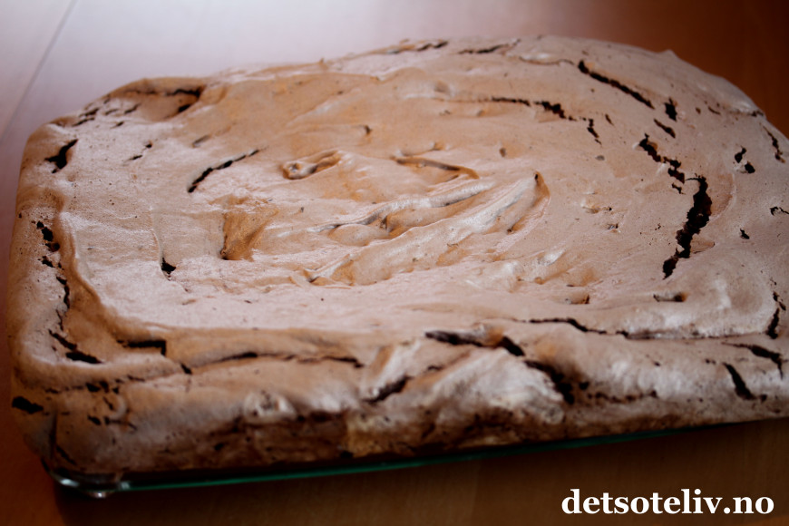 Der fulgte jeg oppskriften slavisk, og det ble hard kjeks. I går lagde jeg denne langpanne oppskriften, og endelig fikk jeg det til. Jeg pisket marengsen lenger enn i oppskriften (ca.30-40 min), også reduserte jeg steketiden til 1 time og 15 min. Neste gang tenker jeg det holder med 1 time.