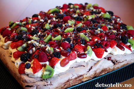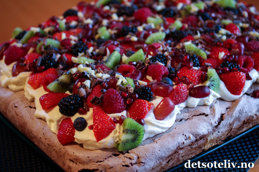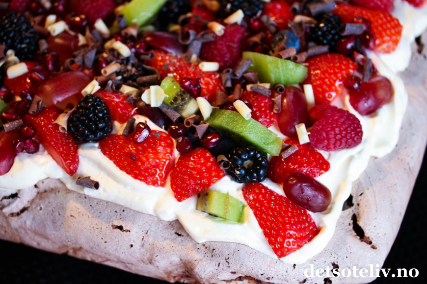 Du kan lage bunnen klar flere dager før servering hvis du ønsker det. På serveringsdagen dekker du marengsbunnen med masse pisket krem og dynger på med frukt og bær av hjertens lyst! Jeg elsker kombinasjonen av klassiske bær som blåbær, bringebær, bjørnebær og jordbær sammen med litt mer eksotiske smaker av kiwi, druer og granateple!